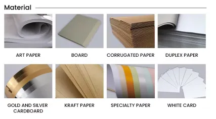 आर्ट पेपर, बोर्ड, कोरुगेटेड पेपर, डुप्लेक्स पेपर, व्हाईट कार्ड, क्राफ्ट पेपर, स्पेशल पेपर, गोल्ड आणि सिल्व्हर कार्डबोर्ड, ऑफ सेट पेपर |